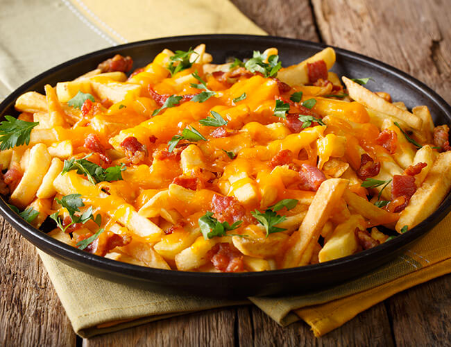 fries with cheese, bacon, sour cream, and